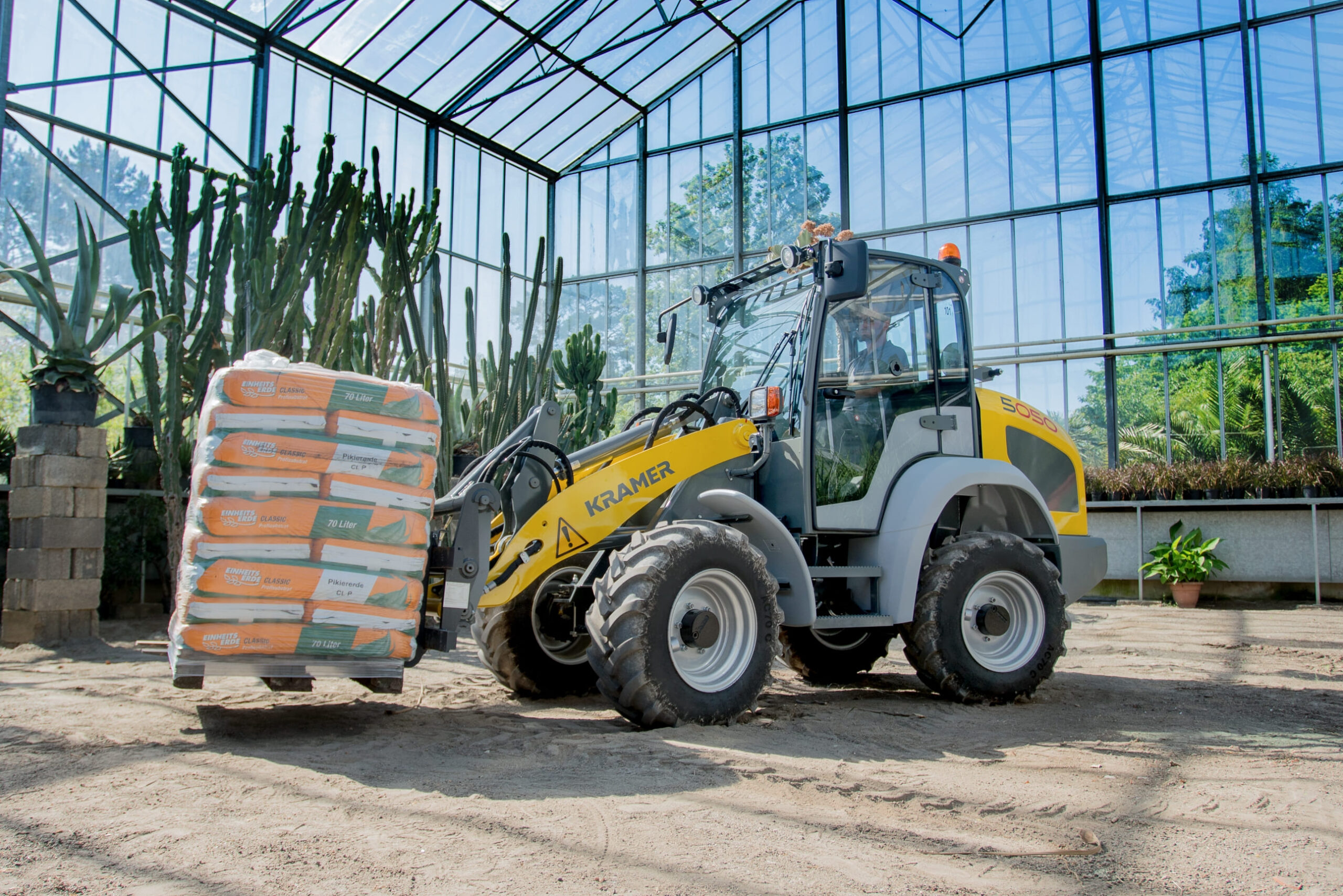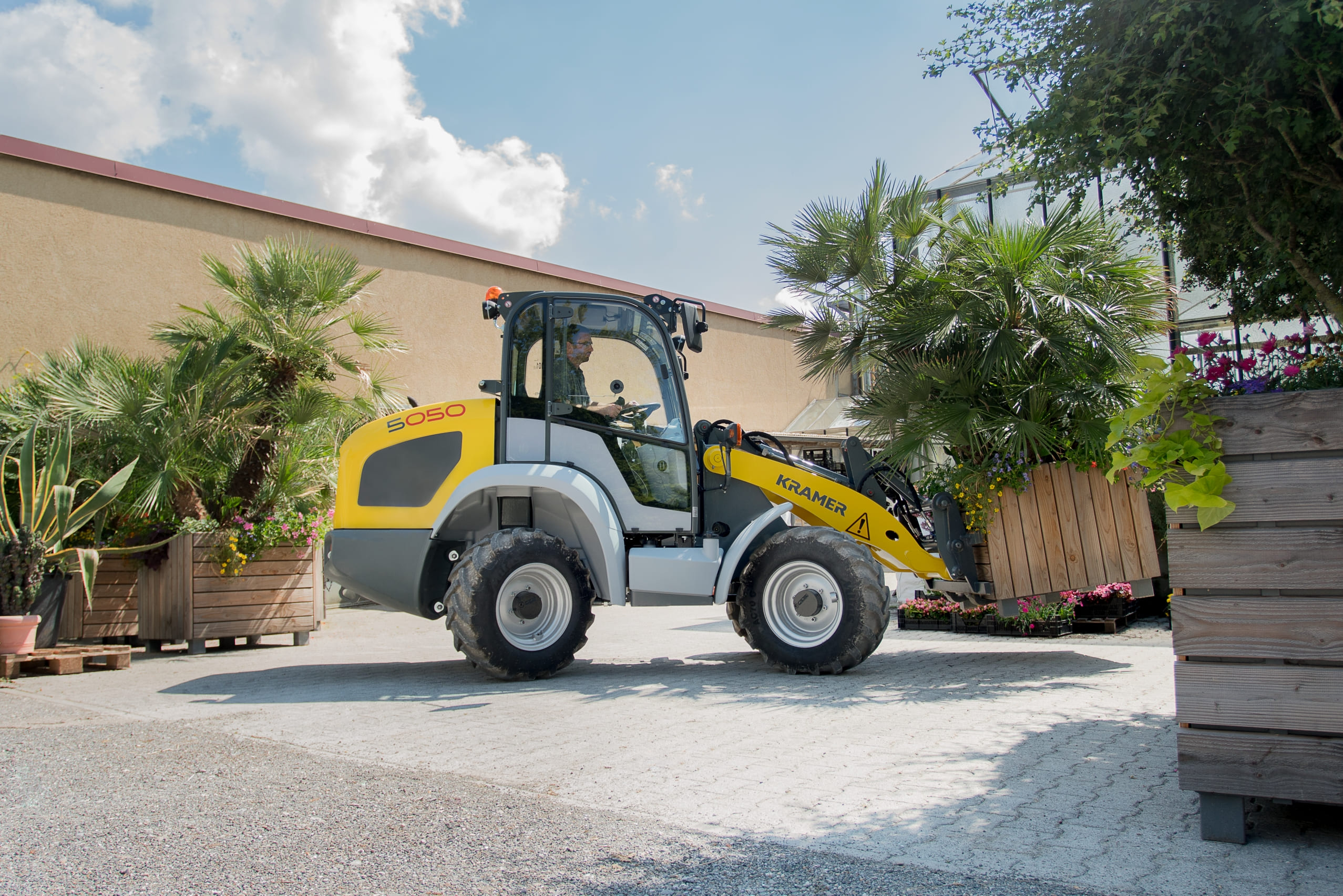 В оснащенні колісного навантажувача Kramer 5050 компанія демонструє особливу інновацію: машина відрізняється дуже низькою власною вагою 2 620 кг і, в той самий час, перекидним навантаженням до 1 700 кг. Завдячуючи міцній та компактній конструкції, а також простому транспортуванню, колісний навантажувач використовується переважно в садівництві та ландшафтному будівництві. Переміщення важких піддонів з тротуарною плиткою або завантаження тривісних вантажівок — лише частина задач, з якими впорається 5050.