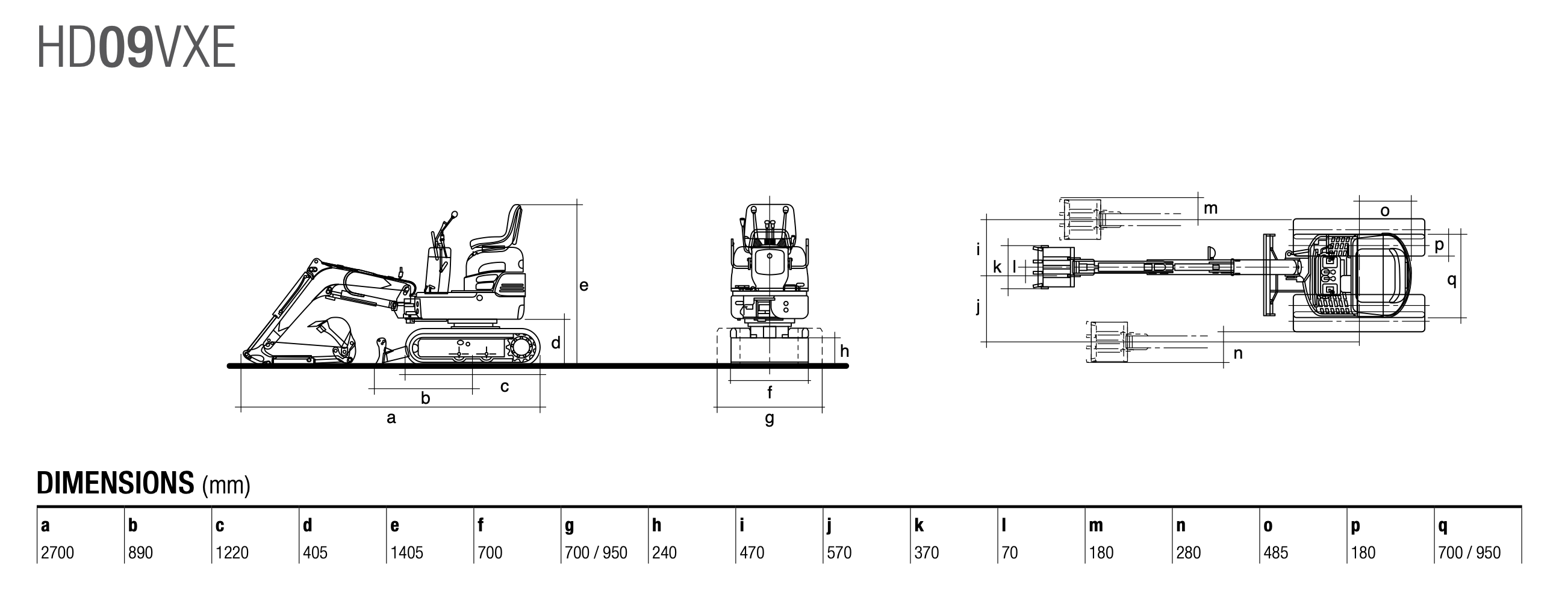 Мікроекскаватор HD9VXE, нова надкомпактна модель, використовує технології машин вищого класу. Потужність та швидкість земляних робіт гарантовані при роботі в обмеженому просторі: при невеликих ремонтних роботах, при земляних роботах та обслуговуванні каналізаційних систем, у тунелях, де не можуть працювати більші машини, а також у садівництві та розпліднику.